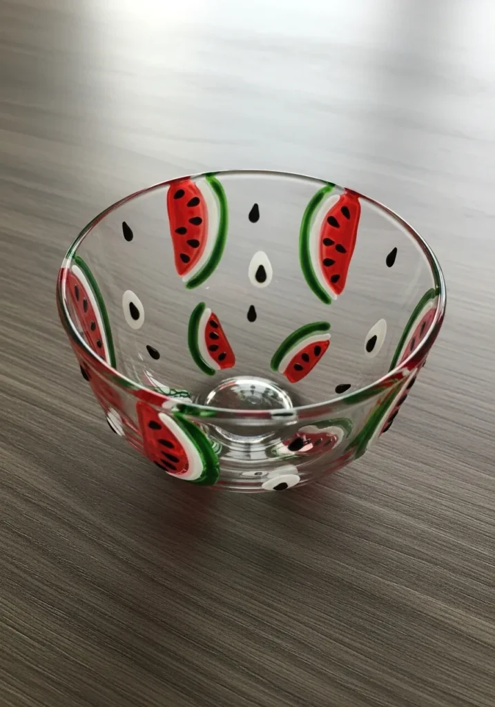 This bright glass snack bowl is covered with juicy watermelon slices painted along the rim of the bowl. Each slice shows vibrant red fruit, tiny black seeds, and a crisp green rind that pops beautifully against the clear glass. The playful pattern wraps around the bowl and gives the piece a fun summer picnic feeling.