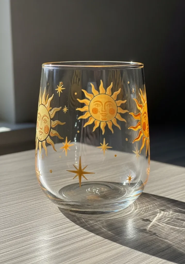 This elegant tumbler features a glowing golden sun surrounded by tiny stars and celestial details painted across the glass. The sun has soft rays spreading outward while delicate stars sparkle around it, creating a dreamy cosmic look. The metallic gold paint catches the light beautifully and gives the glass a warm glowing finish.