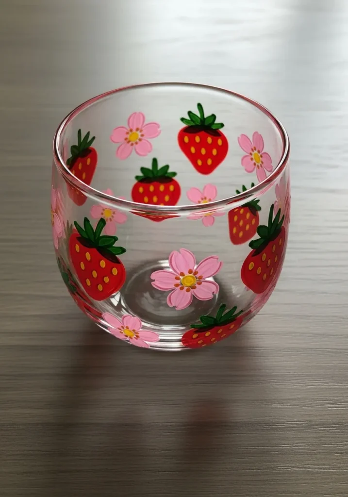 This adorable little dessert glass is covered in bright strawberries and tiny pink flowers that feel fresh and summery. Each strawberry is painted in a vibrant red with tiny seeds and leafy green tops. The small flowers scattered around the berries add a soft garden feel to the design. The clear glass background keeps everything looking light and cheerful.