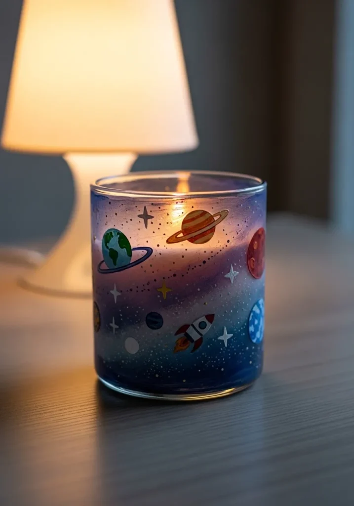 This dreamy glass candle jar is painted with a glowing galaxy scene filled with planets, stars, and deep cosmic colors. Shades of purple, midnight blue, and soft pink blend together to create a beautiful space inspired background. Small painted planets and sparkling stars are scattered across the glass, giving the jar a magical night sky feeling. When a candle is lit inside, the colors glow softly and make the whole piece feel warm and atmospheric.